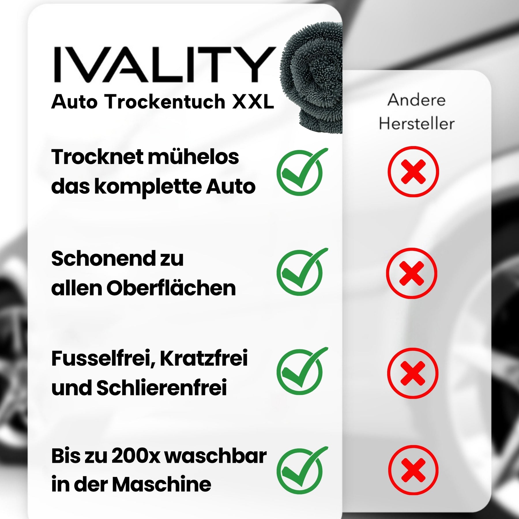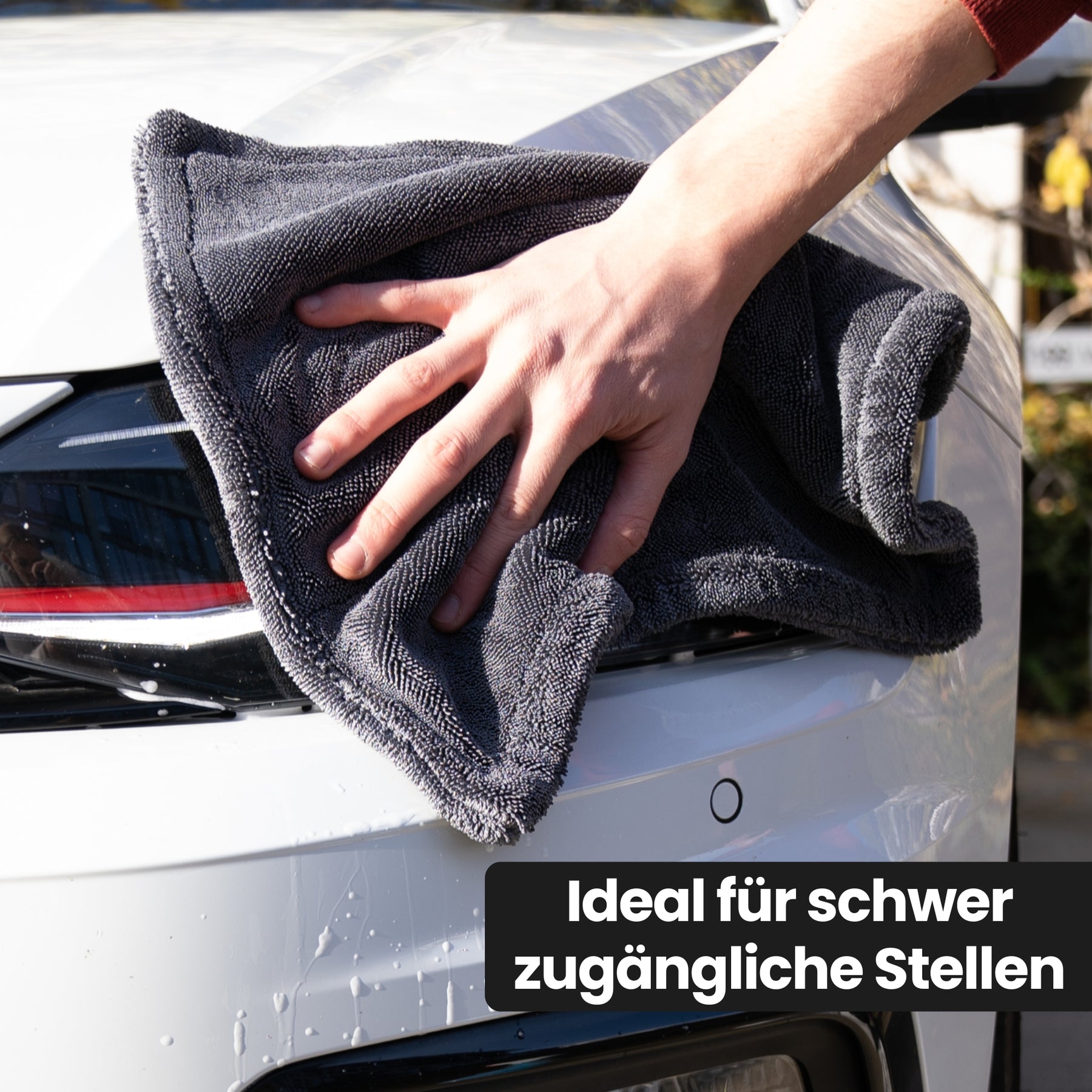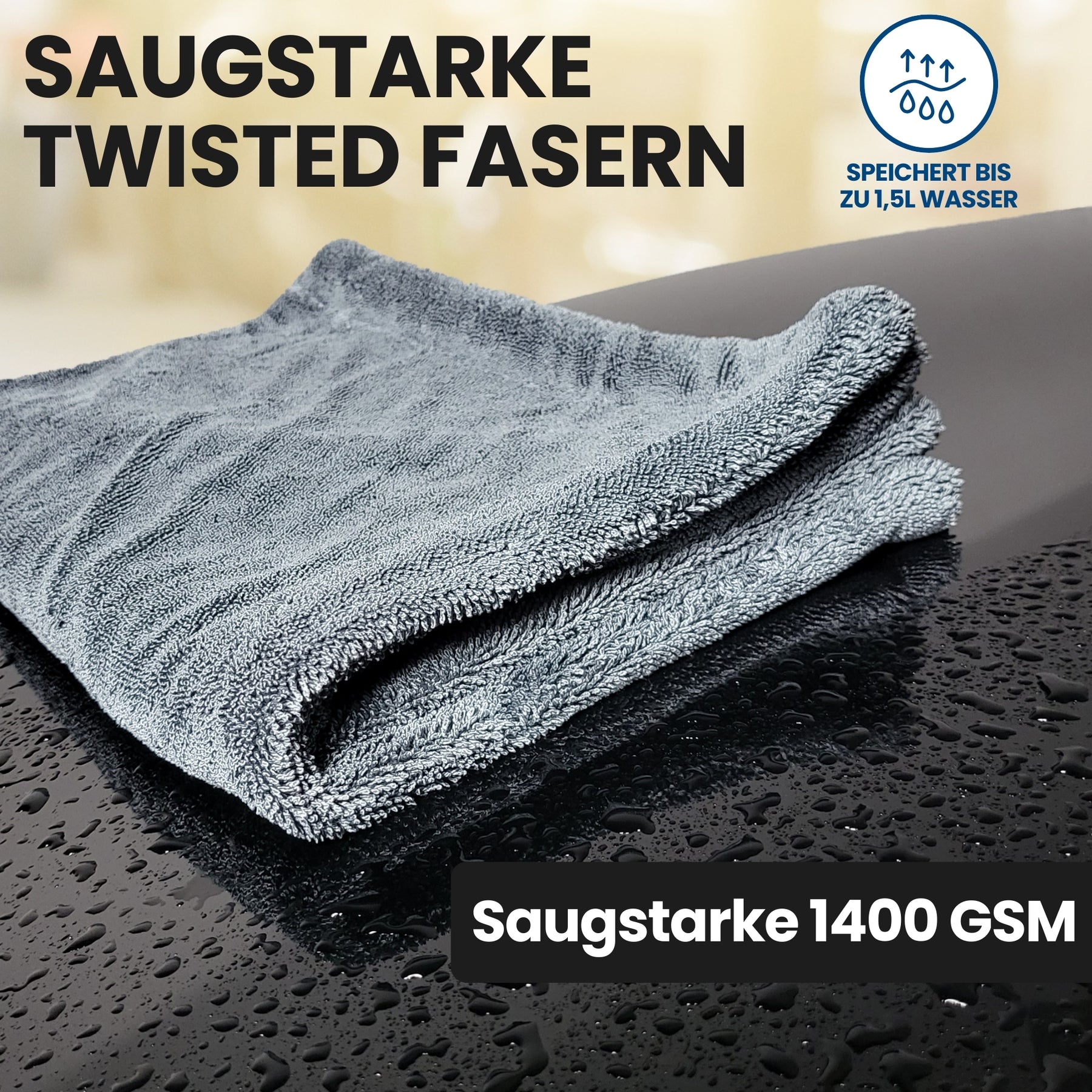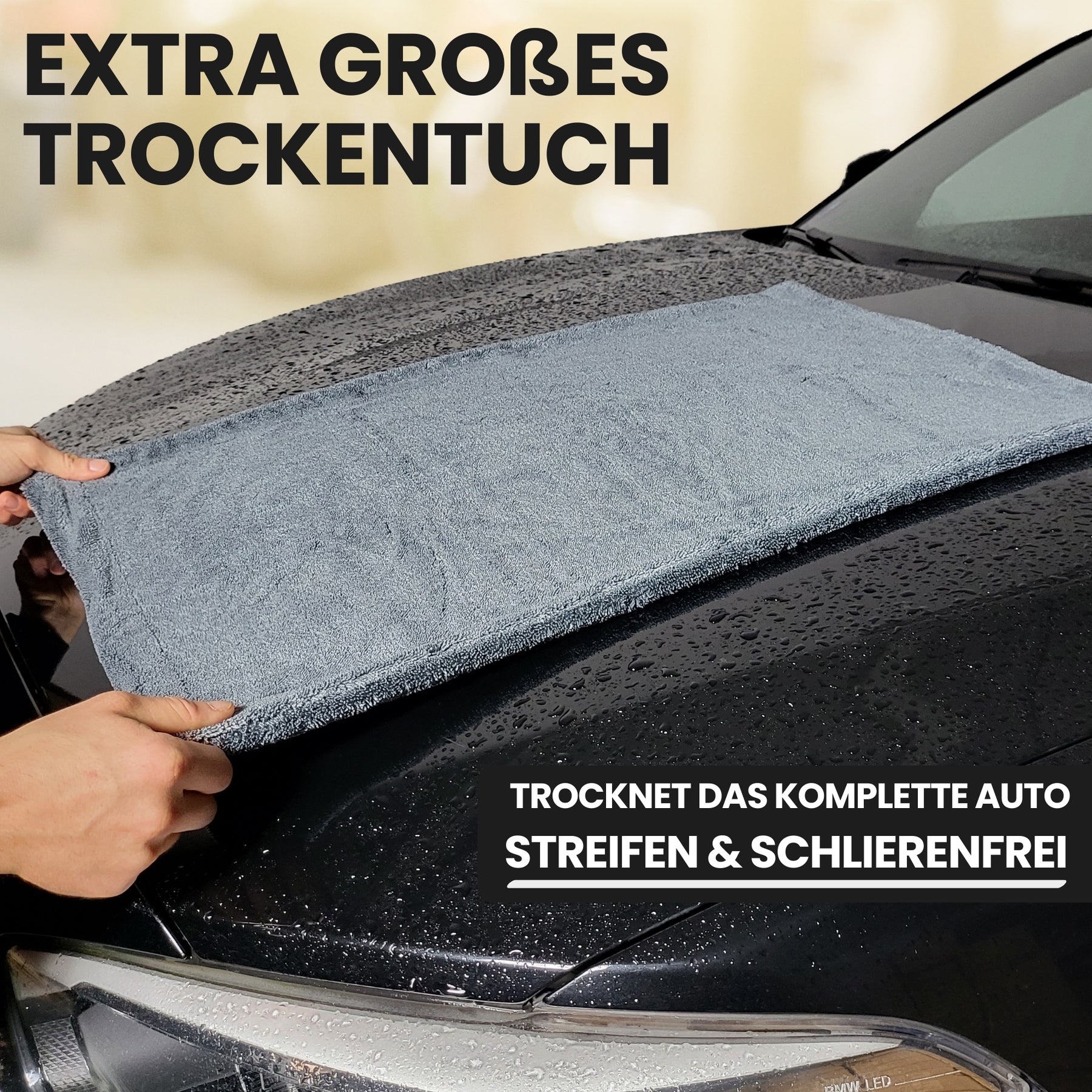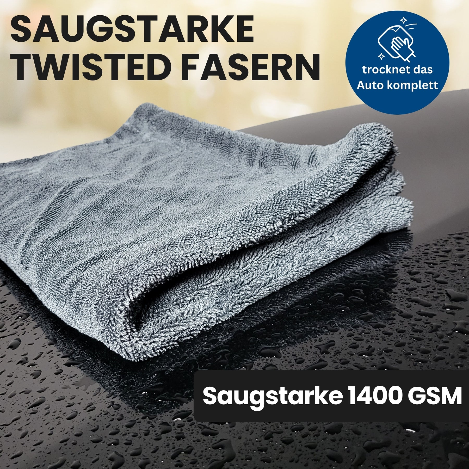Das saugstarke Auto Trockentuch ist ein spezielles Tuch, das extra für die Autopflege entwickelt wurde und 1400 GSM (Gram pro Quadratmeter) besitzt. Es besteht aus Mikrofasern, die bis zu 10-mal mehr Wasser aufnehmen können als herkömmliche Baumwolltücher. Es trocknet dein Auto blitzschnell und streifenfrei, ohne Fusseln oder Kratzer zu hinterlassen. Es ist weich, flauschig und angenehm in der Hand.