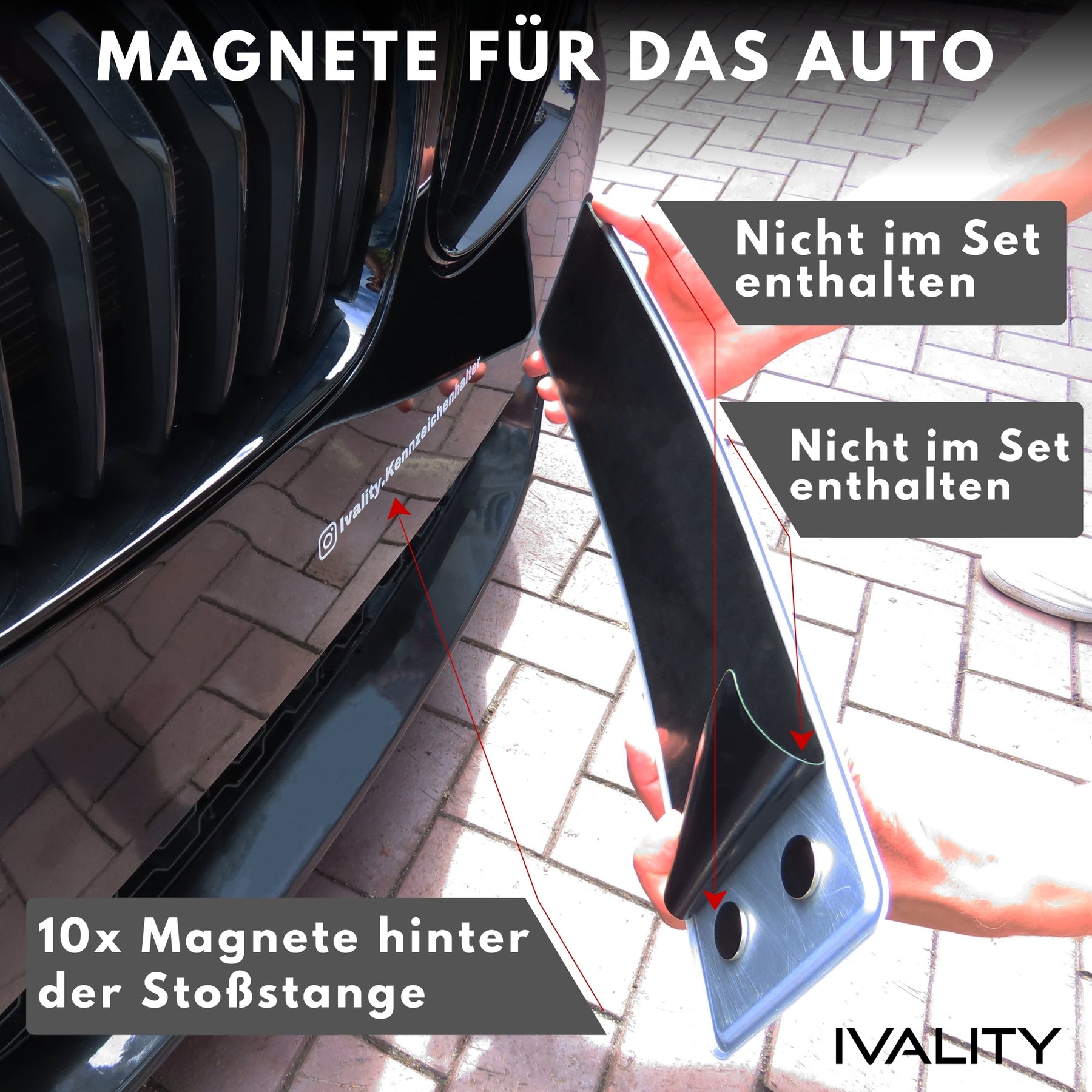 Mit unserem Kennzeichenhalter hinter der Stoßstange seid ihr Halterungen mit dickem Rand und Werbung für immer los! Aufgrund hochwertiger Verarbeitung und der Auswahl bester Materialien (Neodym Magnete, Klebestreifen vom Marktführer 3M und einem Anti-Rutsch-Gummi) hält unser unsichtbarer magnetischer Kennzeichenhalter allem stand. Ein muss für alle Autoliebhaber und ein echter Hingucker auf der Straße. 100% Clean!