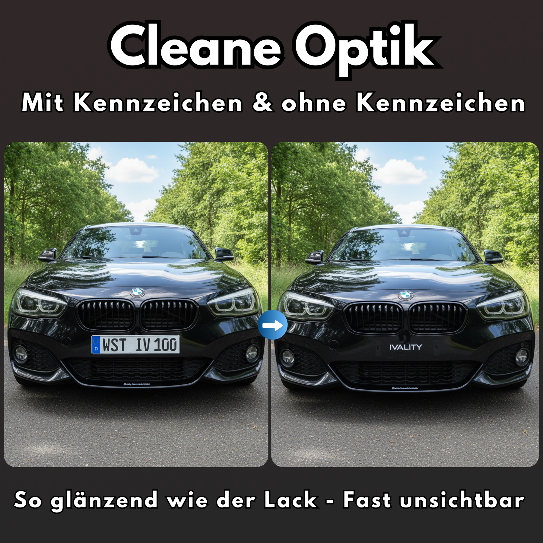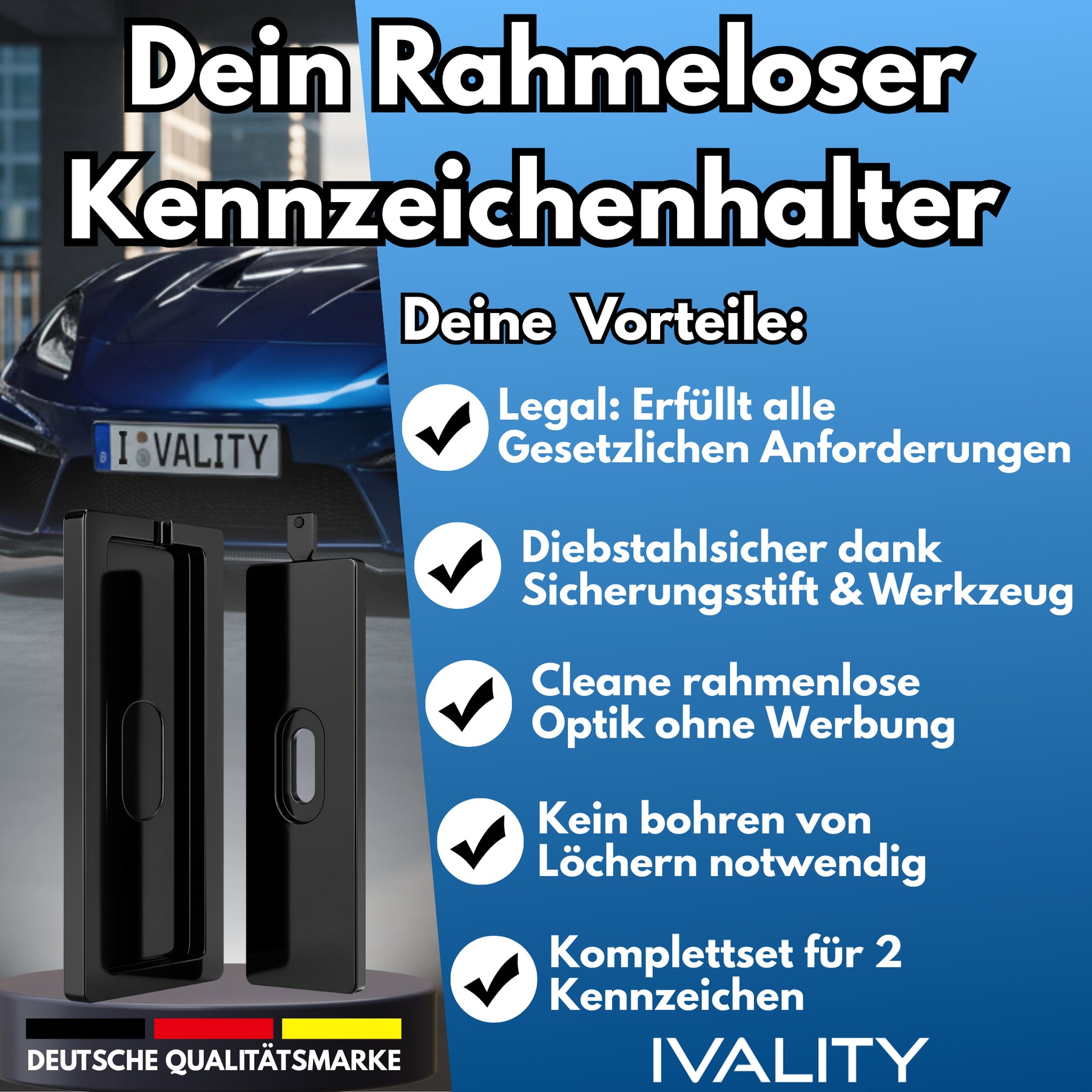 With the patented IVALITY PlateLock frameless license plate holder, you get design, quality, and maximum security all in one product. Say goodbye to bulky standard holders with advertising – this frameless license plate holder gives your vehicle a sporty, clean look, perfect also for show and interchangeable plates.