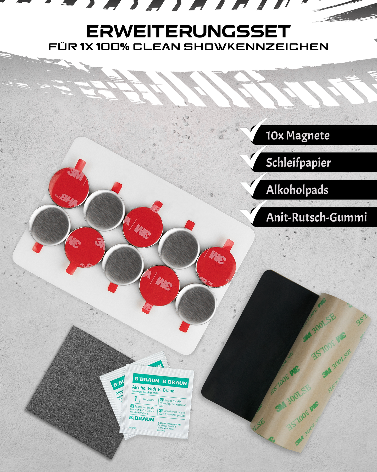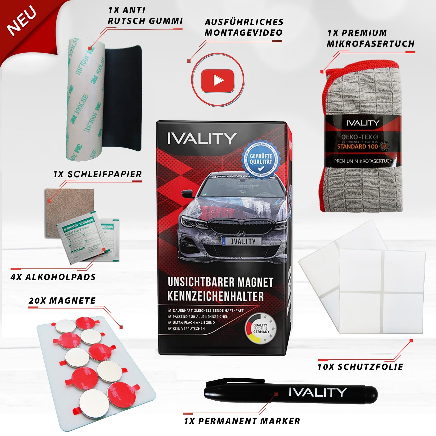 ✅ COMPLETE SET FOR 1 LICENSE PLATE – Everything you need to mount the frameless magnetic license plate holder. In addition to the 20 magnets, the set includes 1x microfiber cloth, 1x 3M rubber protective cover, 10x protective stickers, 2x alcohol pads, 1x sandpaper and detailed assembly instructions & assembly video.