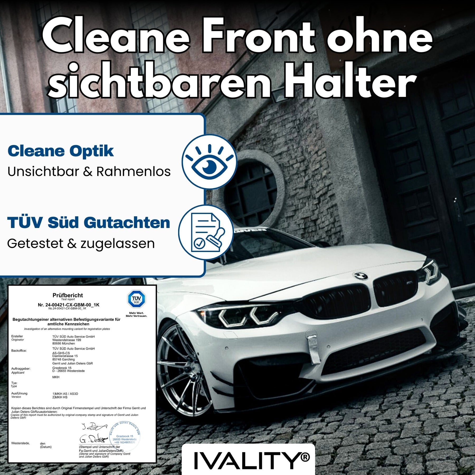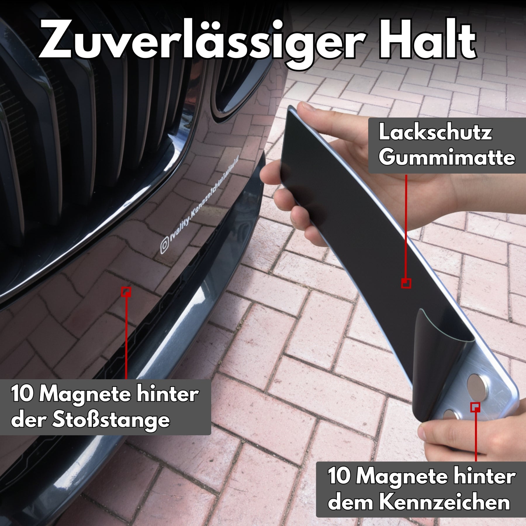 With our license plate holder behind the bumper, you can get rid of brackets with thick edges and advertising forever! Thanks to high-quality workmanship and the selection of the best materials (neodymium magnets, adhesive strips from market leader 3M and anti-slip rubber), our invisible magnetic license plate holder can withstand anything. A must for all car lovers and a real eye-catcher on the road. 100% clean!