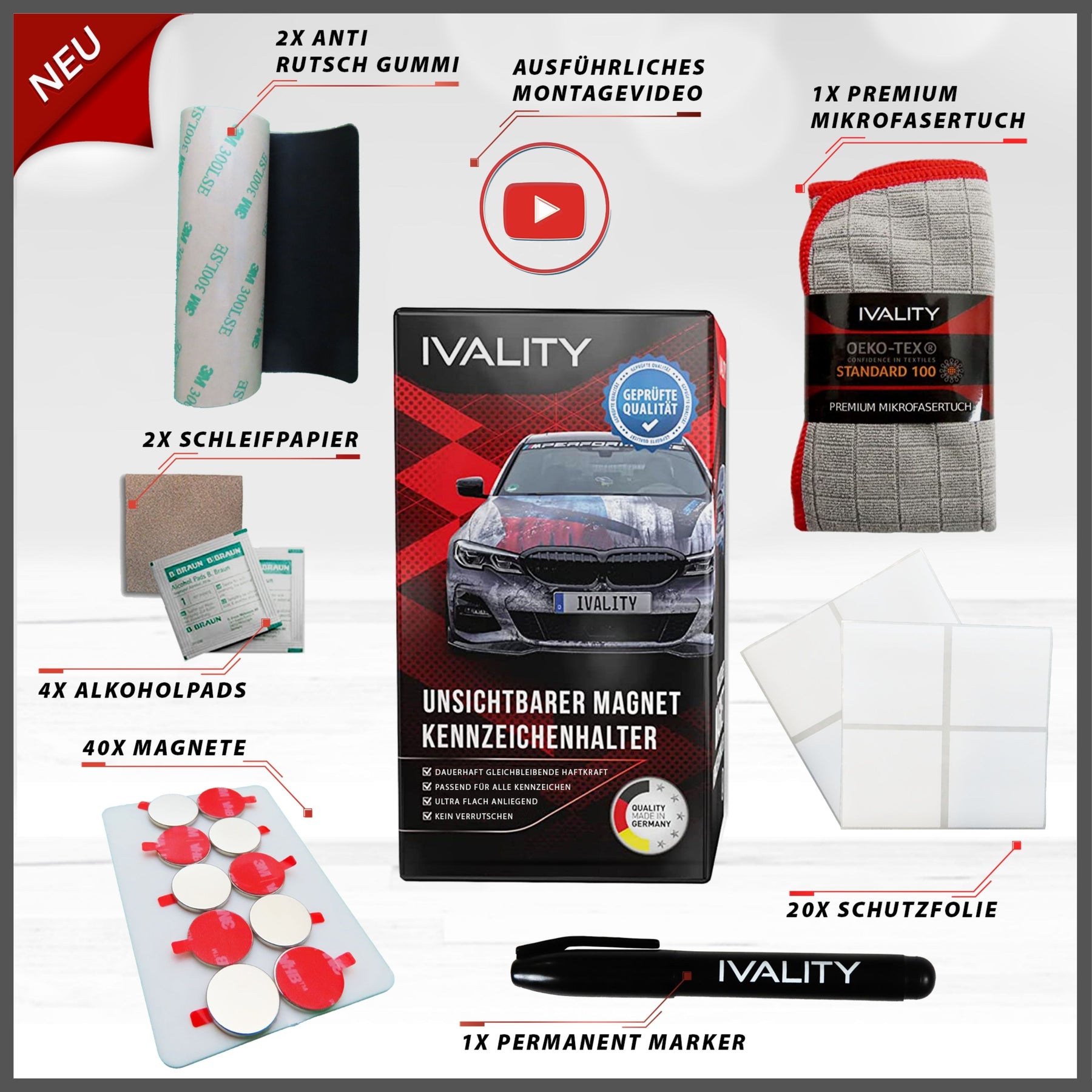 KOMPLETTSET FÜR 1 KENNZEICHEN – Alles was du für die Montage der magnetische Kennzeichenhalter rahmenlos benötigst. Neben den 20 Magneten sind im Set enthalten, 1x Mikrofasertuch, 1x 3M Gummi Schutzüberzug, 10x Schutzsticker, 2x Alkohol Pads, 1x Schleifpapier sowie eine detaillierte Aufbauanleitung & Montagevideo.