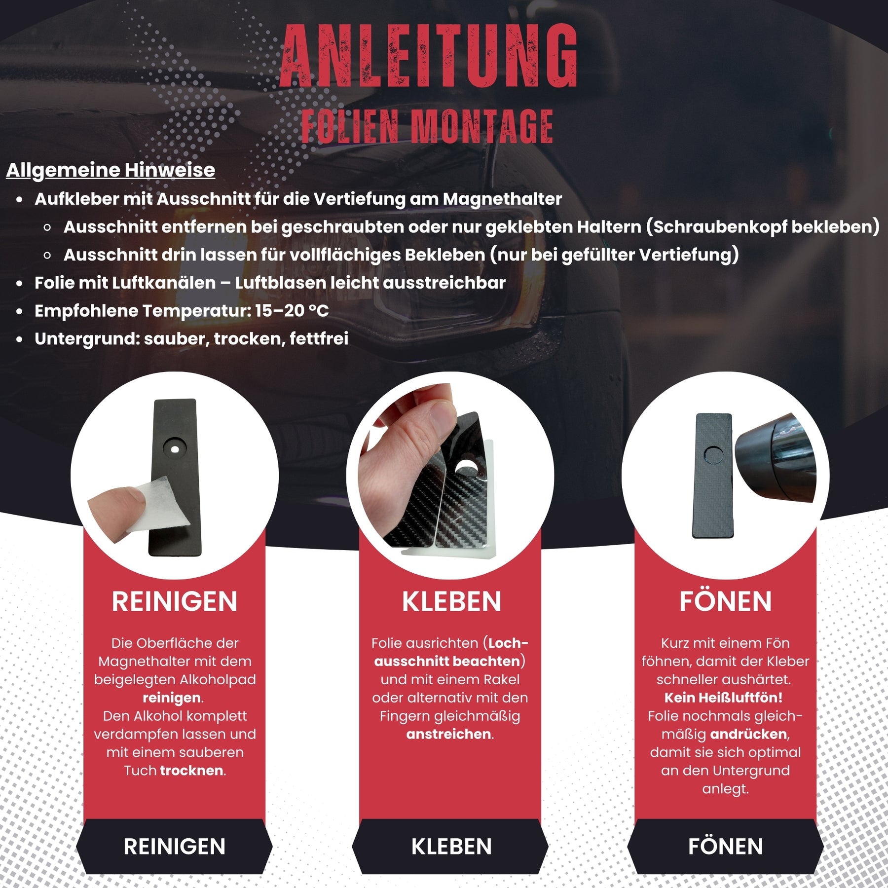 Diese Folie für die Magnete auf der Stoßstange ist die perfekte Ergänzung für dein Fahrzeug: funktional, langlebig und optisch ein echtes Upgrade. Ob sportlich, dezent oder individuell – wähle deinen Stil und setze Akzente.