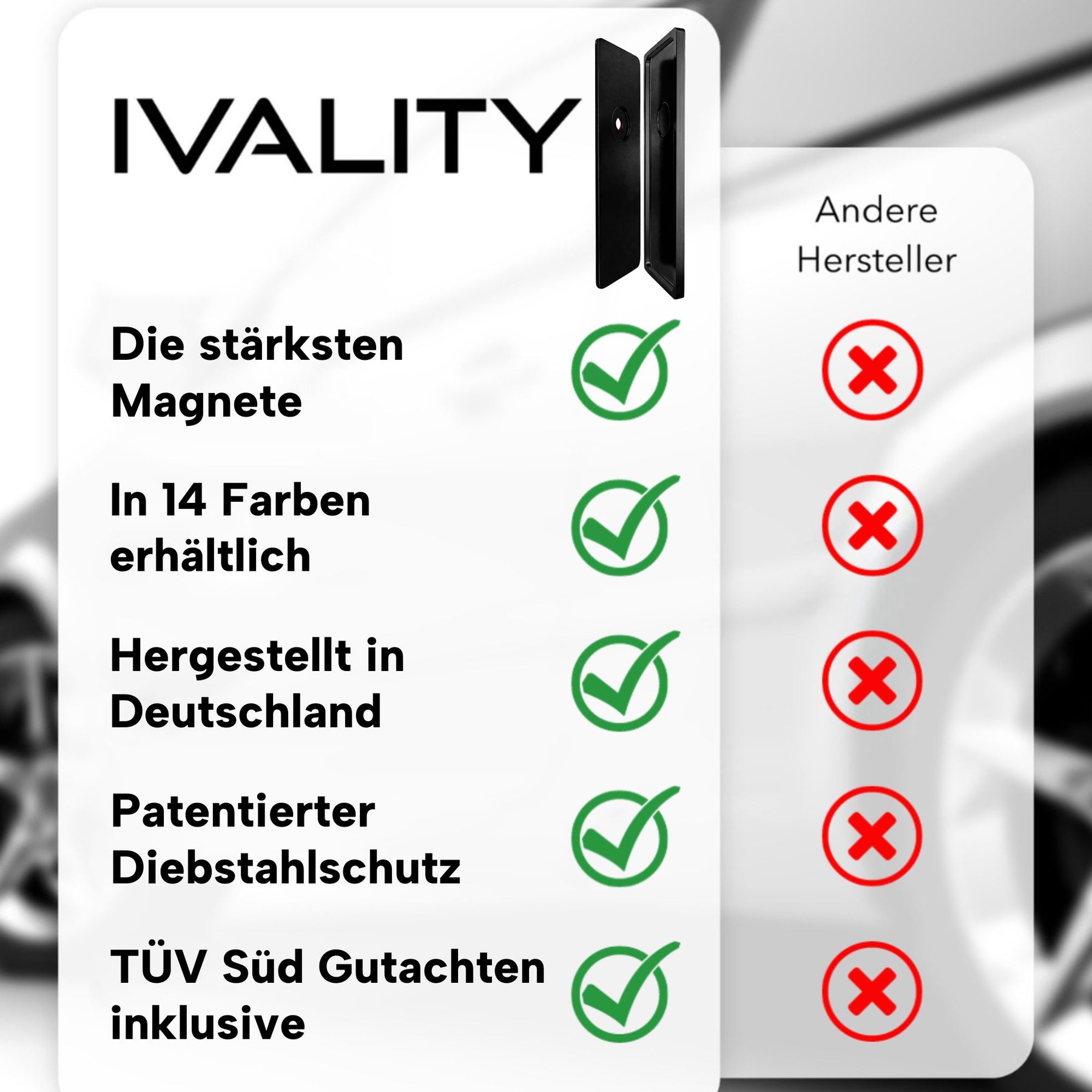 Dein Fahrzeug verdient mehr als gewöhnliche, klobige Kennzeichenhalter mit Werbung. IVALITY magnetische Kennzeichenhalter sind nicht nur ein Statement, sondern auch eine praktische Lösung, um Deinem Auto einen unvergesslichen Look zu verleihen. Ebenso die perfekte Lösung für das schnelle Wechseln von Show- oder Wechselkennzeichen.